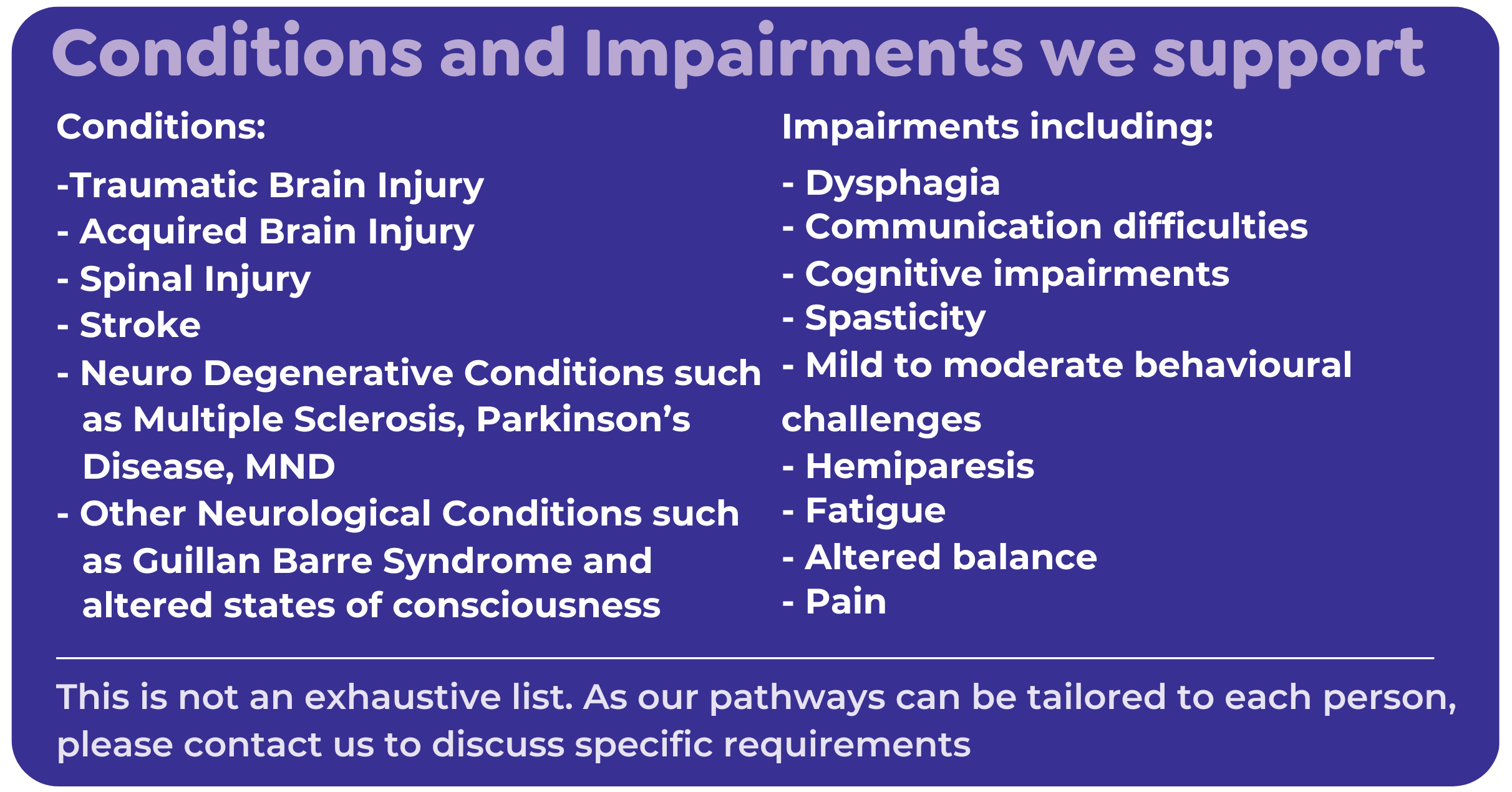 Conditions and impairments the Service can support include, but are not limited to: